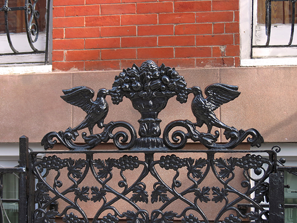 Head south, peruse the magazine store window for bird photographs then head west. Look for a swinging gate with a pair of doves feasting face-to-face on a bowl of grapes.