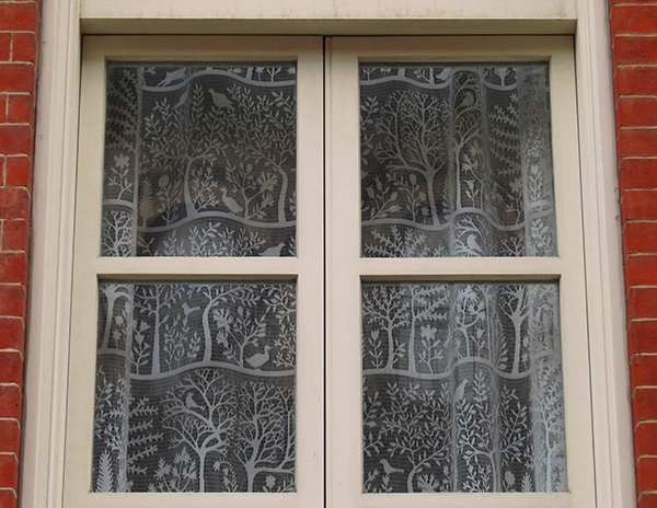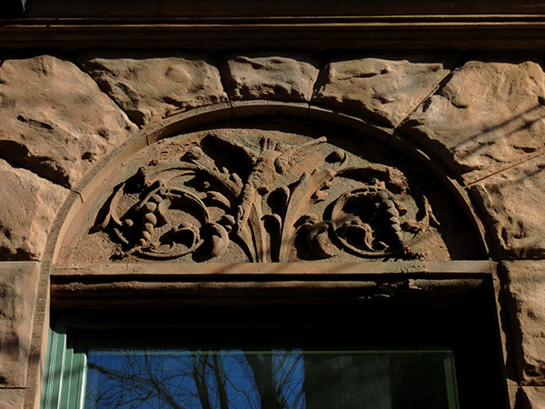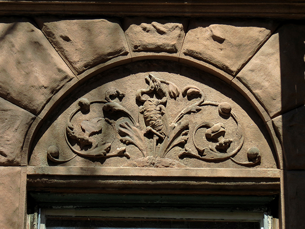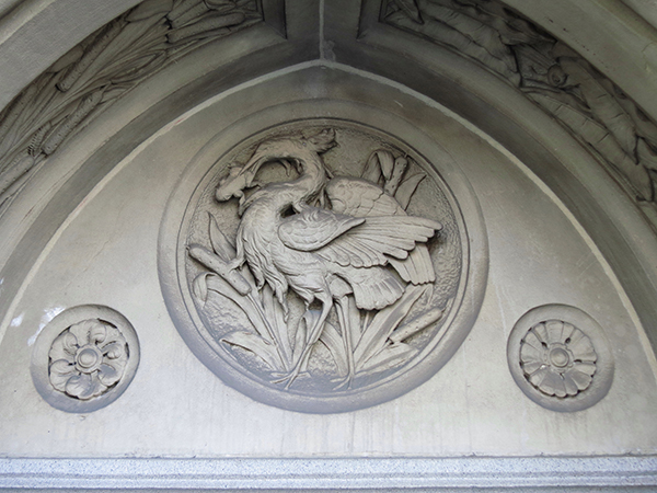 A quad-riptych of herons fish in a series of brownstone window lintels. Two of the bas reliefs are seriously weathered, but you can still make out the long-necked tableaus.