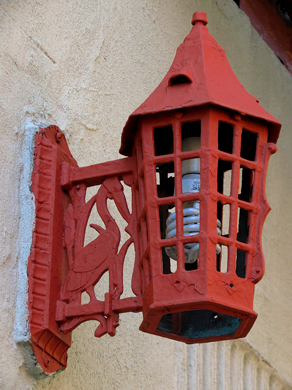Heading west from here, pelican pairs grace two orange lanterns. The wood-cut ambience of these light fixtures is charming.