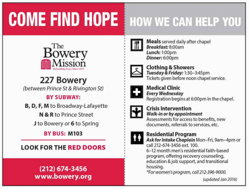 You have some options. Some people like to hand out the Bowery Mission Card (bowery.org/media/uploads/7-3_media/7.3.5_resourcecards.jpg), which explains when and where food, shelter, clothing, showers, and medical care are available at 227 Bowery, just below East Houston Street. Some wrap a dollar or two around the card. Others hand out the Department of Homeless Services Card with information on available services—http://www1.nyc.gov/assets/dhs/downloads/pdf/intake_drop_in_centers.pdf. Some like to have a grocery store or fast food store gift certificate for a modest amount at the ready to hand out. Others may provide a subway card with a single fare on it.