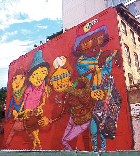 To unexpected murals by the Brazilian street artists OS GEMEOS (twin brothers Gustavo and Otavio Pandolfo) depicting break dancers on the walls surrounding the empty lot at 143 West 14th Street (between 6th and 7th Avenues) – until construction starts, at least!