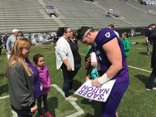 The College of Holy Cross conducted their annual Spring Football game on April 14, 2018. Holy Cross’ new football Coach demonstrated a positive mind set by providing a free football clinic to the children of Worcester, MA before the game. After the Spring game all of the children were invited to come on the field to obtain the autographs of Holy Cross Football players. Pictured is Holy Cross Junior Teddy Capsis signing an autograph for a young fan. Capsis was selected to be placed on a Holy Cross Football Magnet that was given out to the first 500 spectators that attended the game. Capsis, #91, is in the center of the three players on the magnet. Photos courtesy of Doric Capsis.
