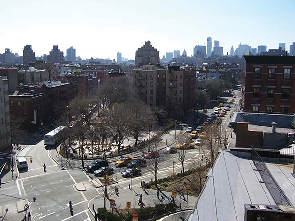 Bleecker Street Park development followed the implementation of a new traffic pattern that involved the bending connection of Hudson Street to Eighth Avenue, elimination of part of Bank Street, and widening of Bleecker Street’s end as it too is blended into Hudson Street. Historic Abingdon Square, ca. 1830, is just north of this intersection, and was also affected by the traffic pattern changes.
