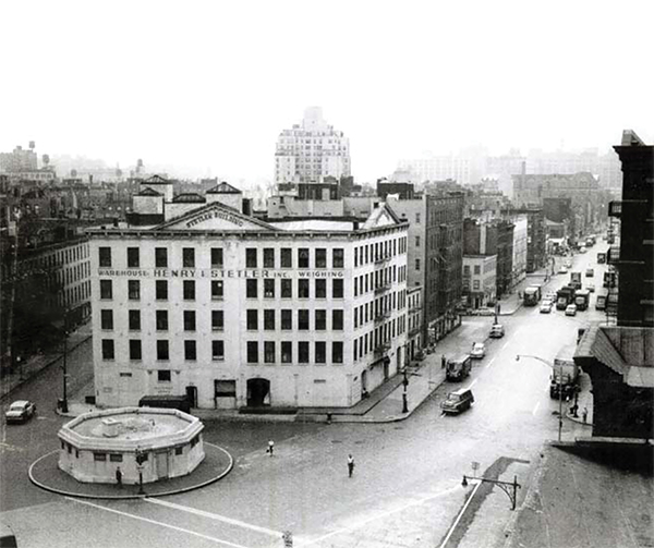 An octagonal comfort station shown here immediately to the north of the warehouse and surrounded by streets, also doubled as a bandstand pavilion. It was later condemned along with the warehouse to build a park. Bleecker Street is at the left of the warehouse, and bends around the pavilion to terminate at Hudson Street.