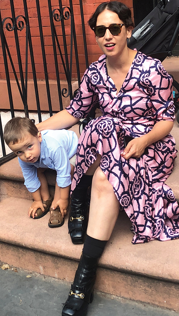FLARE (photo left): Daniela Diletto and her son Luca pause on their stoop on the way to her birthday dinner in the Meatpacking District. Daniela is an art director and graphic designer for clothing companies and other clients. She’s rockin’ her classic silk print dress with black booties and socks with a hidden detail—pink soles!
