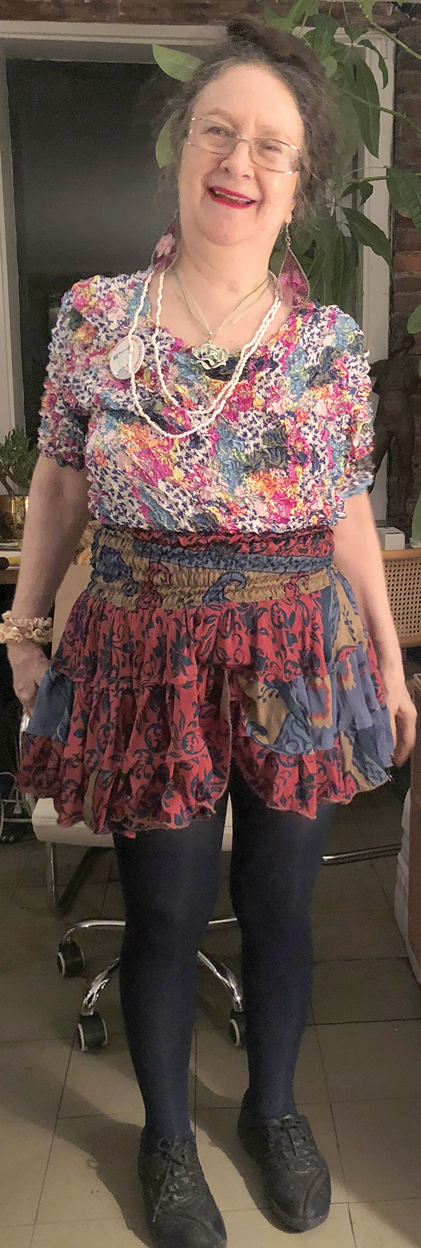 FLAIR (photo center): Carol Yost is one of our dearly loved contributors, well-known for her quirky style, using texture and color to create living art on her body. Her popcorn blouse is irresistibly touchable, and her skirt brings a complementary color palette and bigger ruffled texture, with the translucent purplish teardrop earrings tying both pieces together.