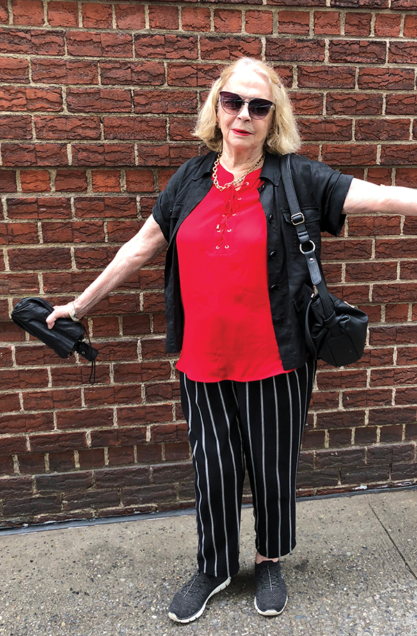 DEBONAIR (photo right): Carol Shapiro is ready for a summer shower with black fold-up brolly and cool black sneaks, but what really makes this outfit pop is the red lace-up blouse and striped pants. Instant eye appeal.