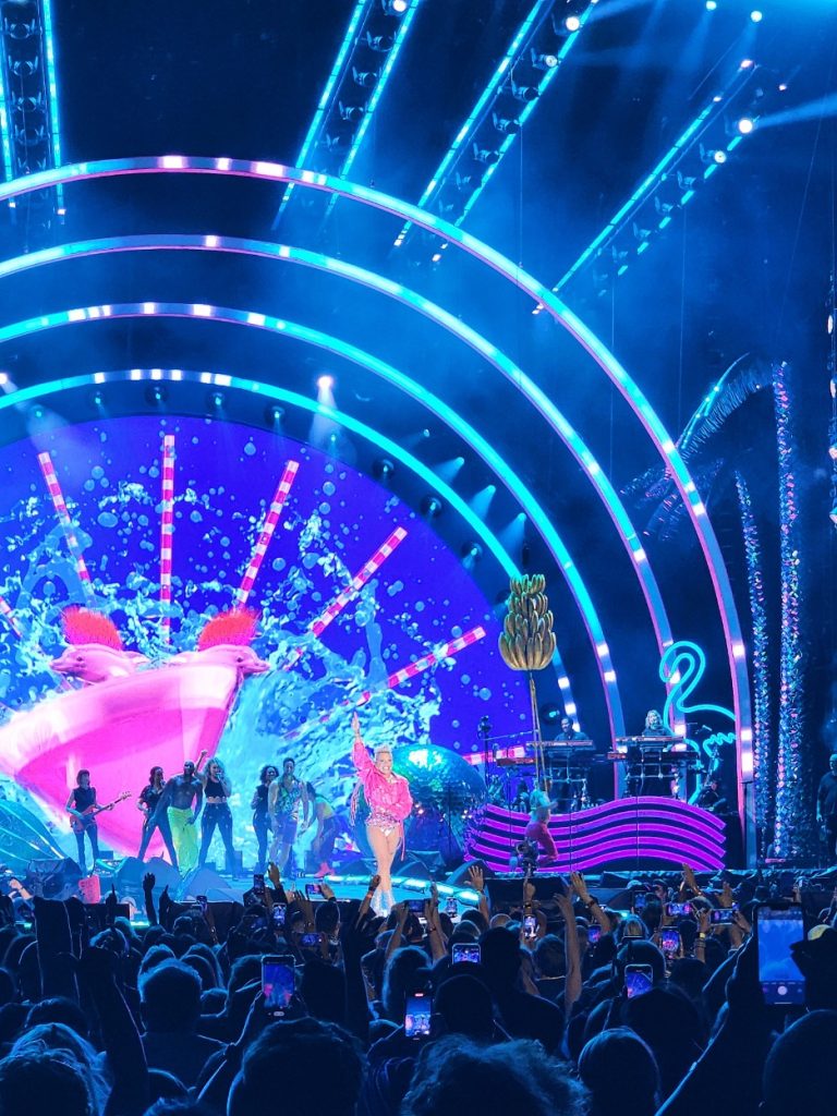 Once I entered the ballpark, I immediately felt as if I was at an awesome carnival. Pink’s pink and blue imagery showcased all around the venue set the tone, as did, the various hues of pink sported by the concert attendees, and the pink cotton candy that was being sold.